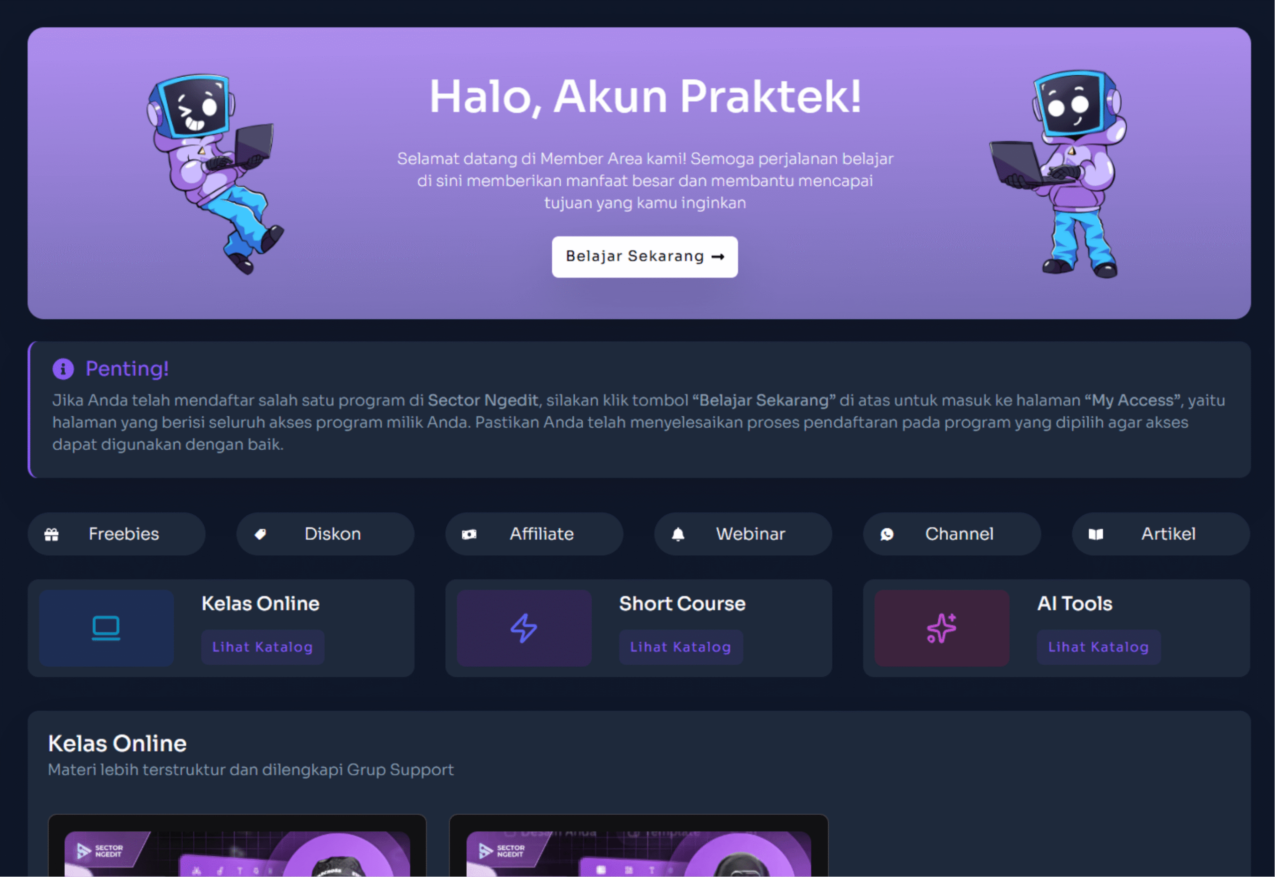 Setelah mendaftar, kamu akan mendapatkan akun untuk masuk ke Member Area eksklusif Sector Ngedit. Semua video, file, dan bonus sudah tersusun rapi berdasarkan urutan belajar, sehingga mudah diikuti dari dasar sampai mahir.